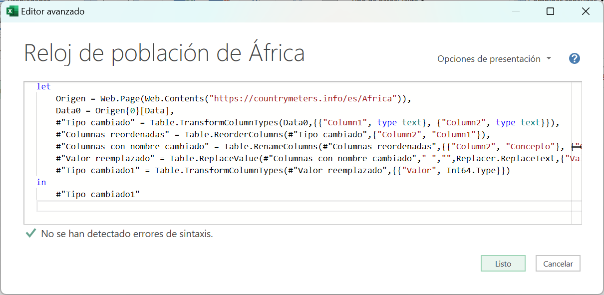 En la barra de fórmulas está el nombre definido para África, por ejemplo: